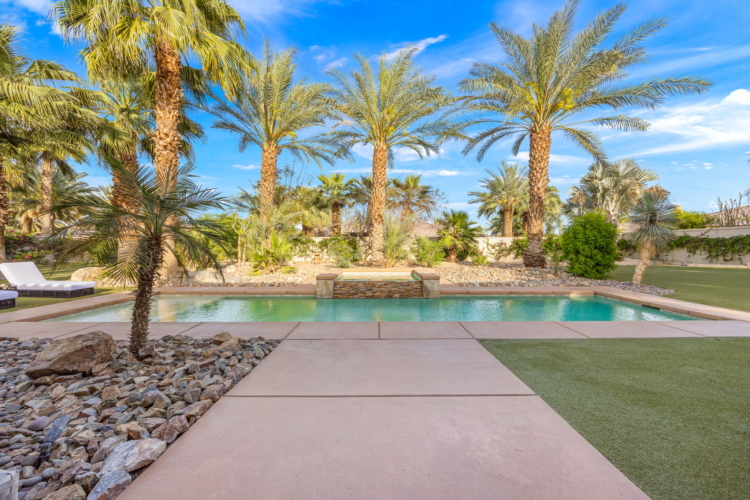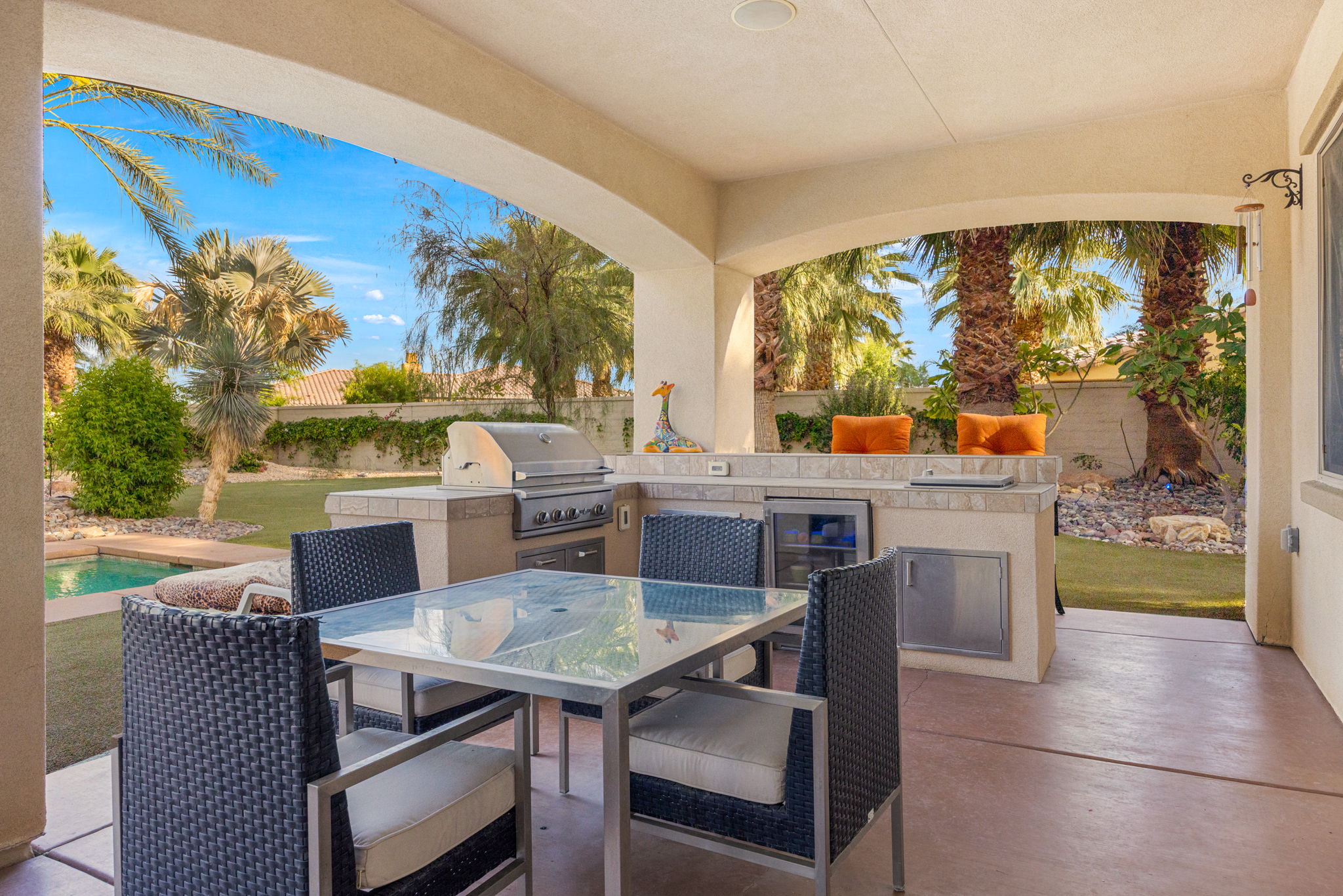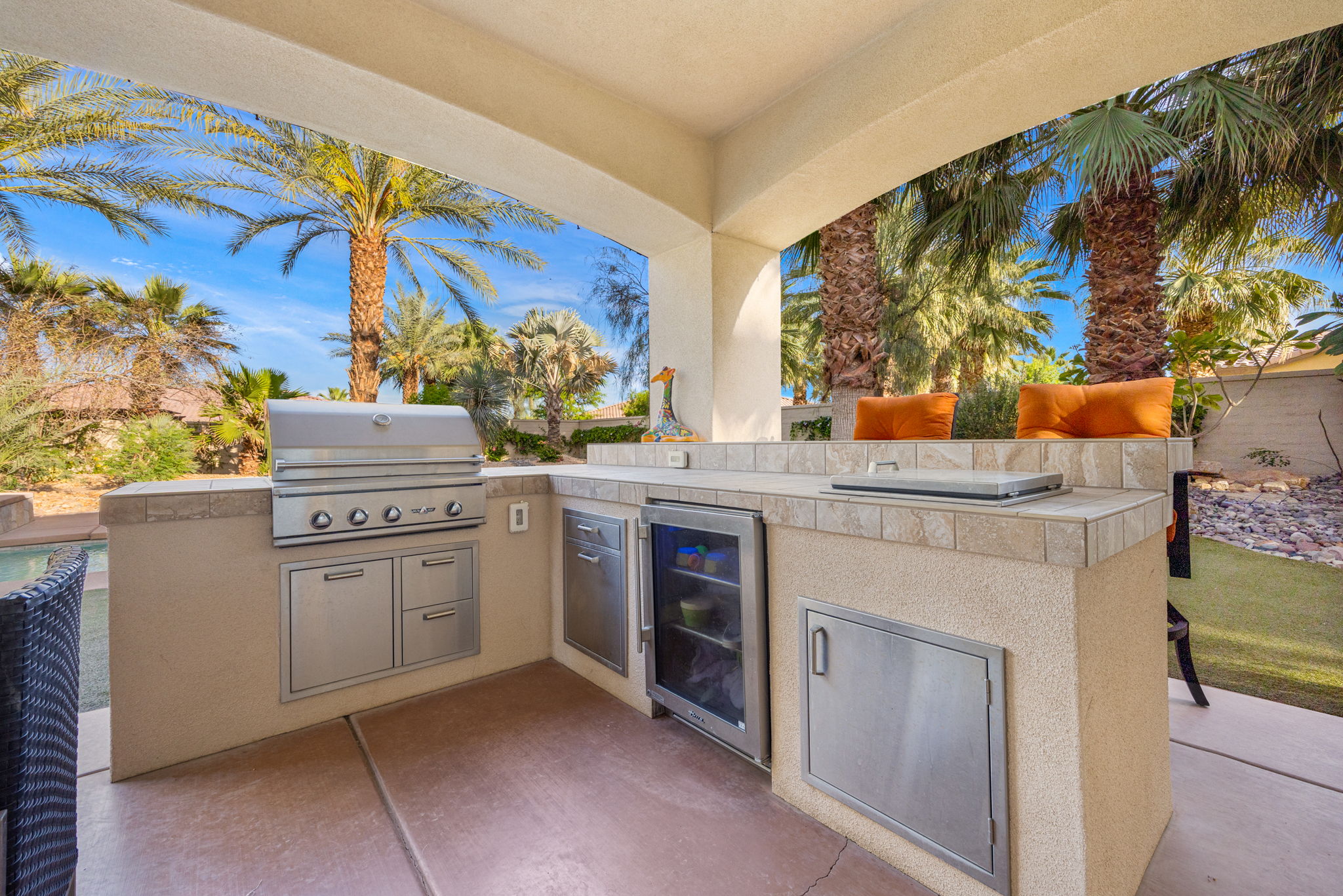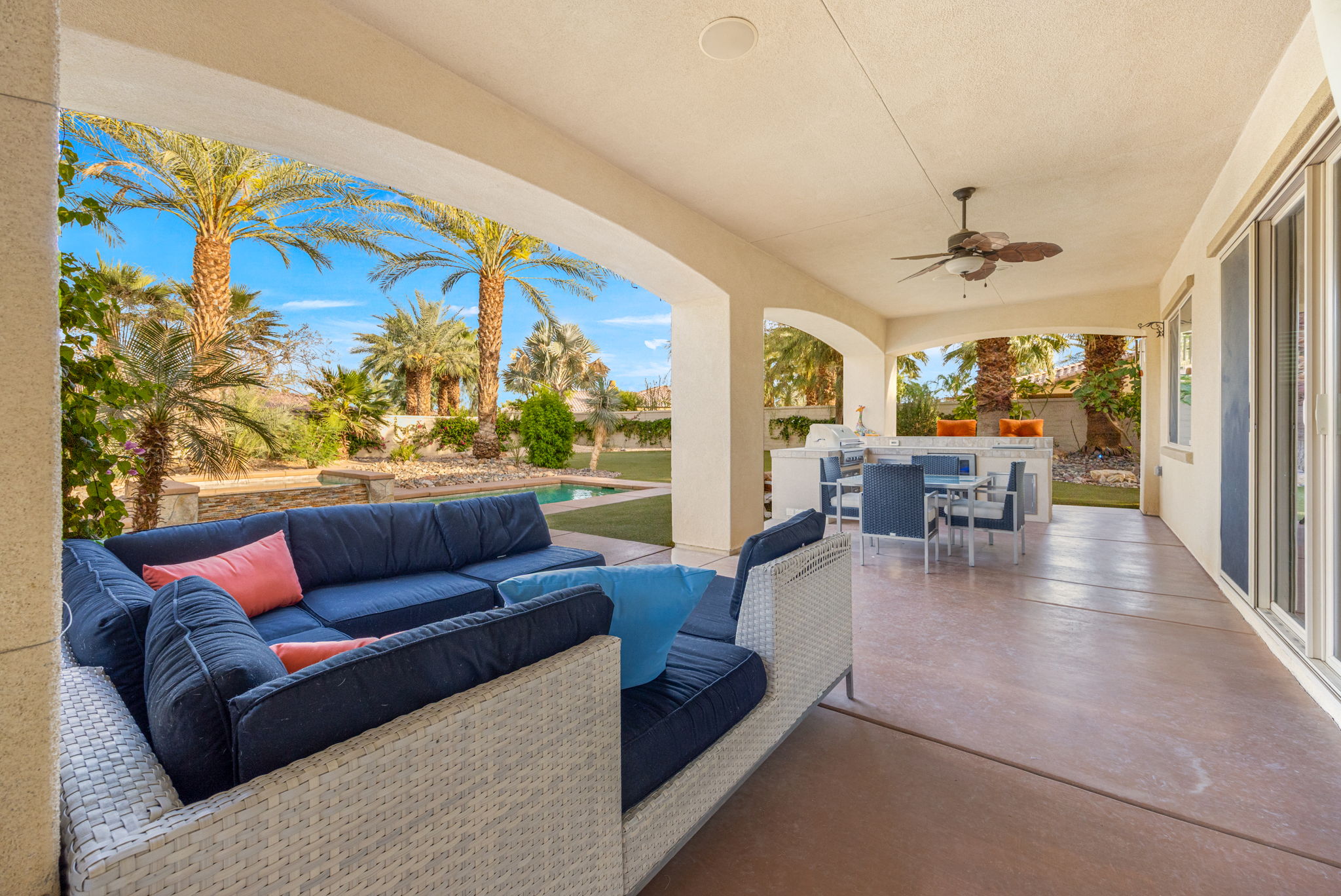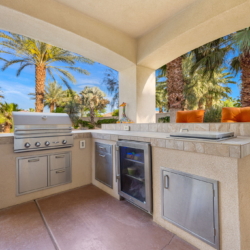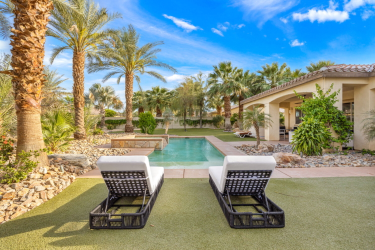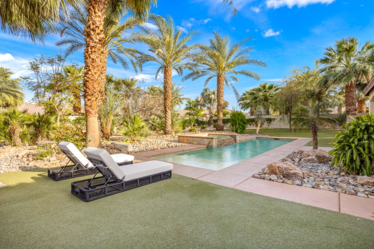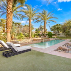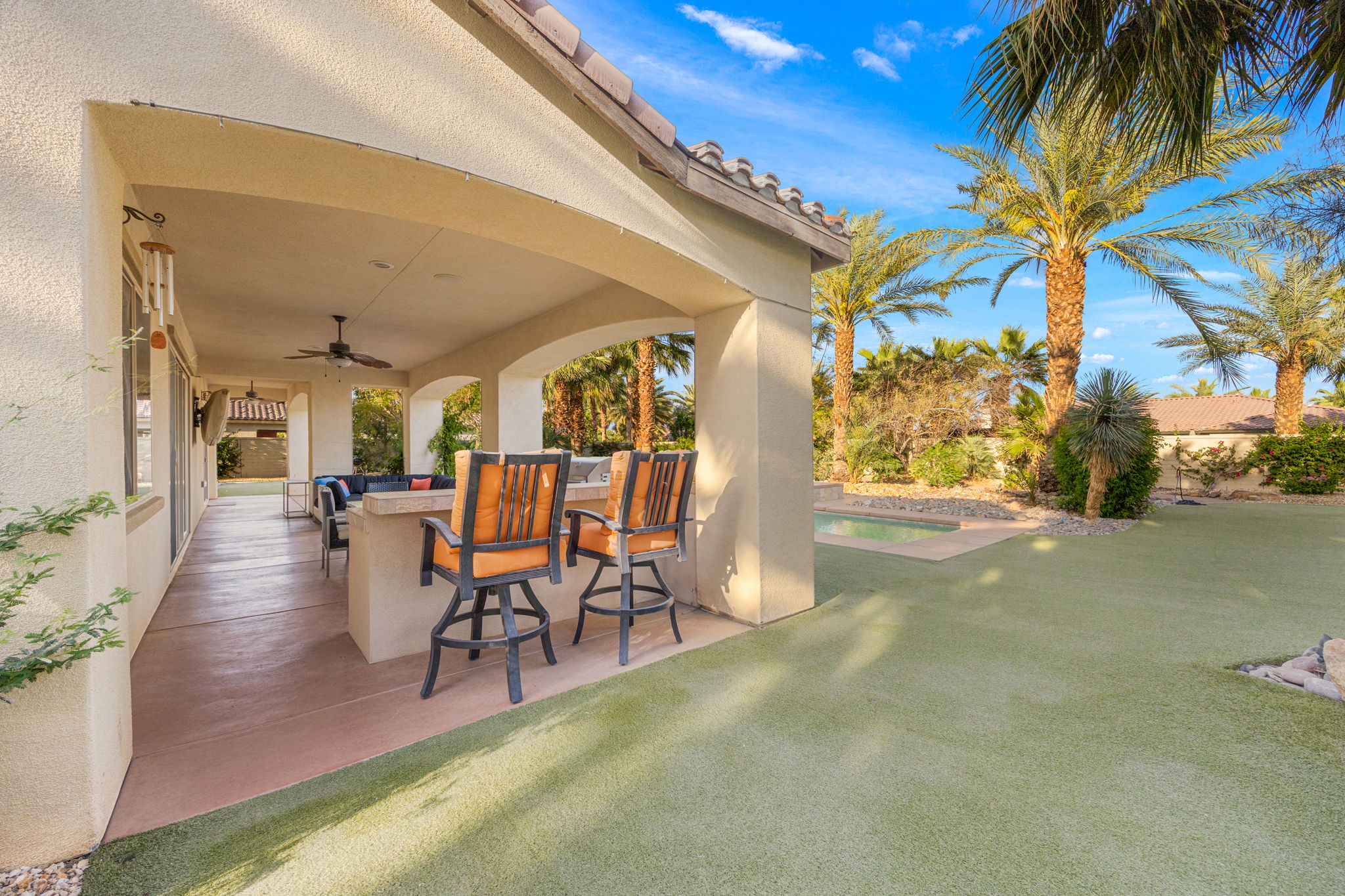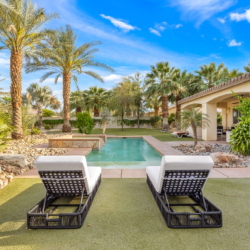 This 5 star luxury estate is set on a spectacular half acre of immaculate meandering stone pathways and artificial always pristine turf set among an oasis of date and palm trees interspersed with flowering plants, a fountain/ waterfall with a full size swimming pool, Baha deck and heated spa beckon amidst the spectacular desert scenery and is magically lit at night. The covered patio as a well appointed stone bar and BBQ with glass table chairs, sectional sofa and lawn chairs allowing relaxation or celebrations as you desire