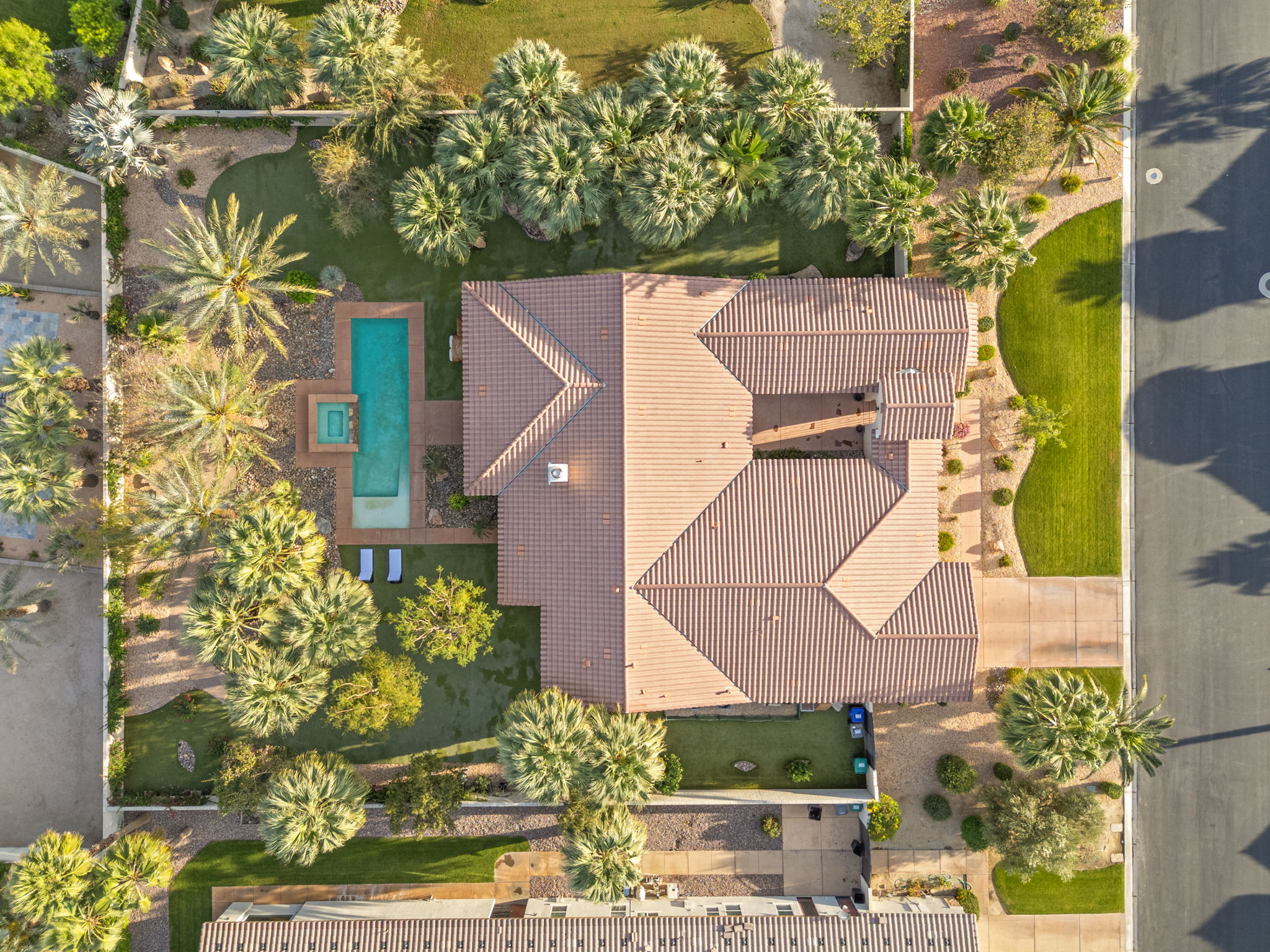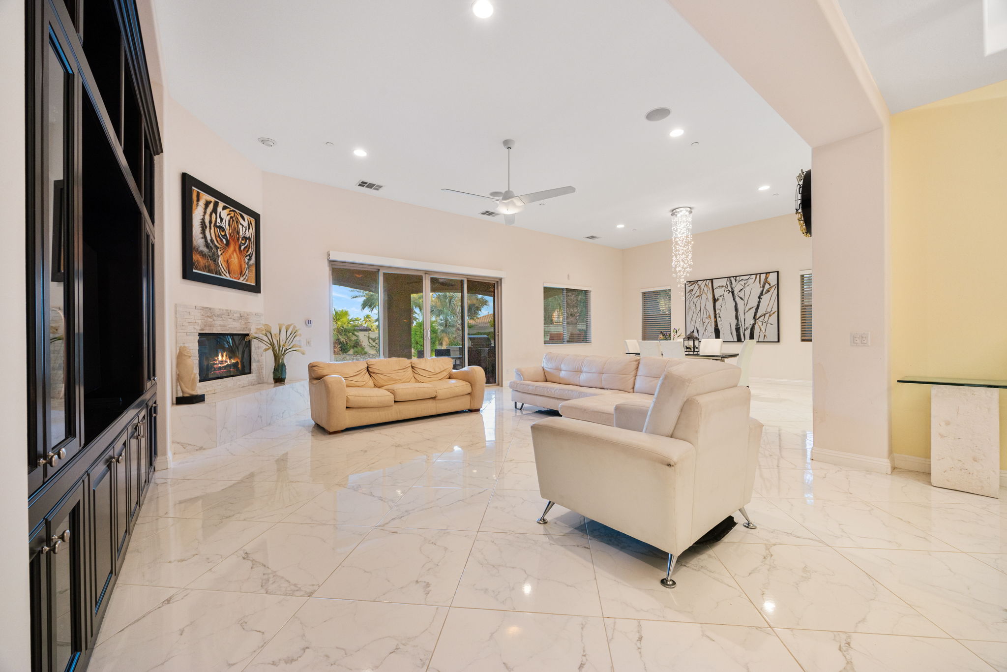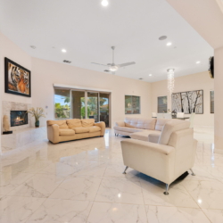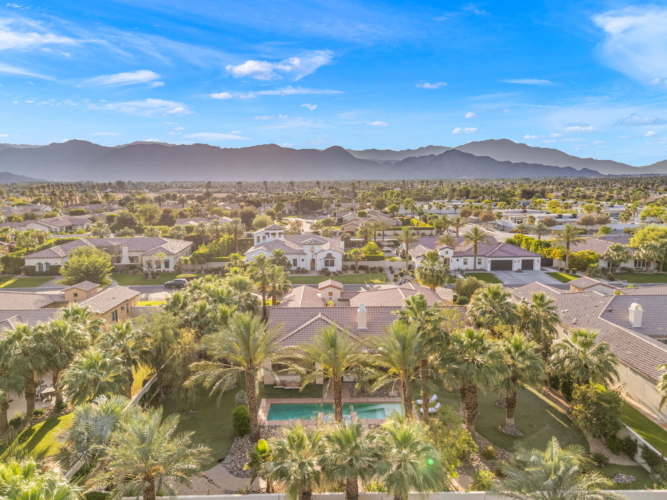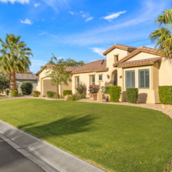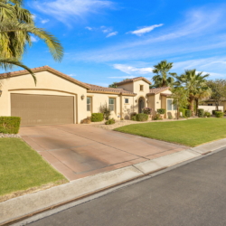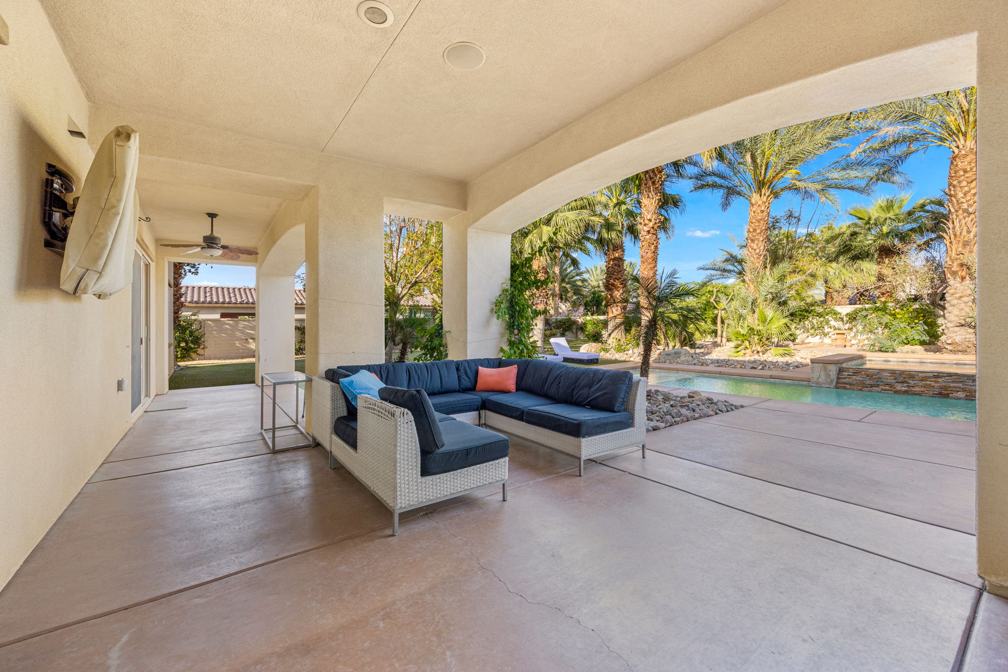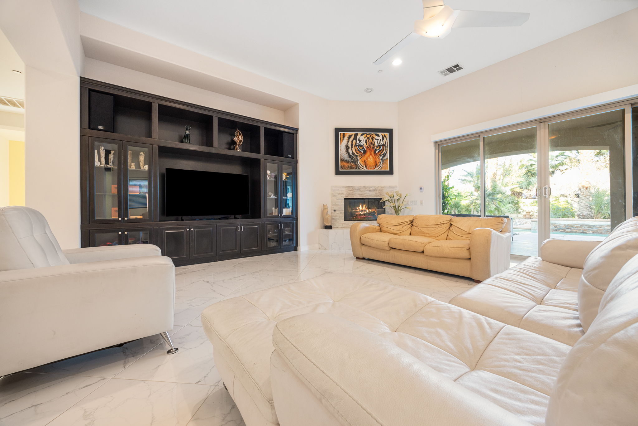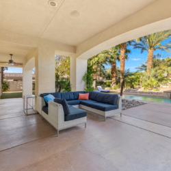 This 5 star luxury estate is set on a spectacular half acre of immaculate meandering stone pathways and artificial always pristine turf set among an oasis of date and palm trees interspersed with flowering plants, a fountain/ waterfall with a full size swimming pool, Baha deck and heated spa beckon amidst the spectacular desert scenery and is magically lit at night. The covered patio as a well appointed stone bar and BBQ with glass table chairs, sectional sofa and lawn chairs allowing relaxation or celebrations as you desire