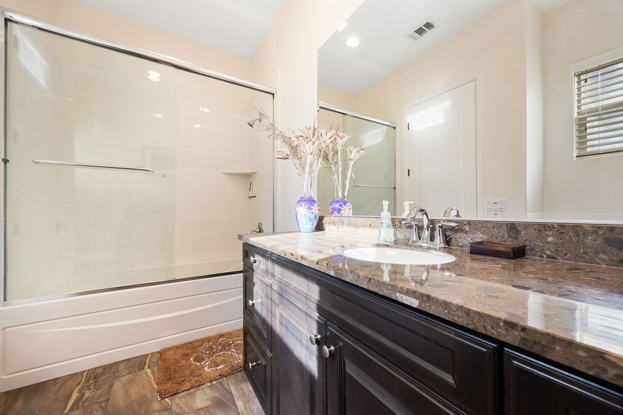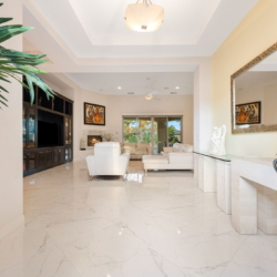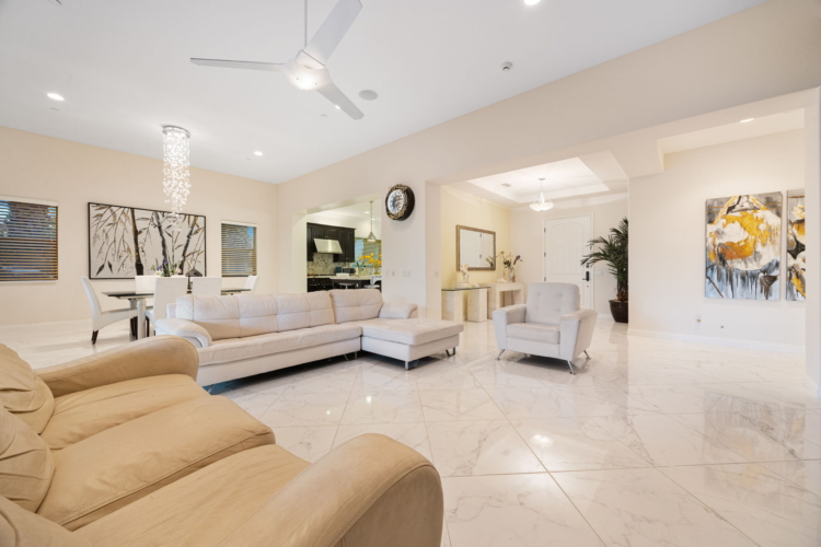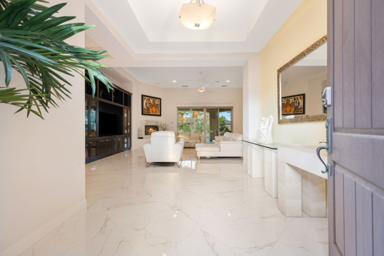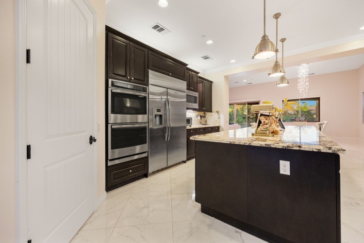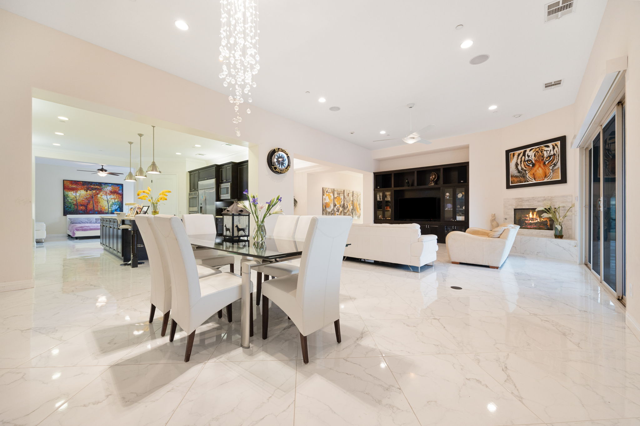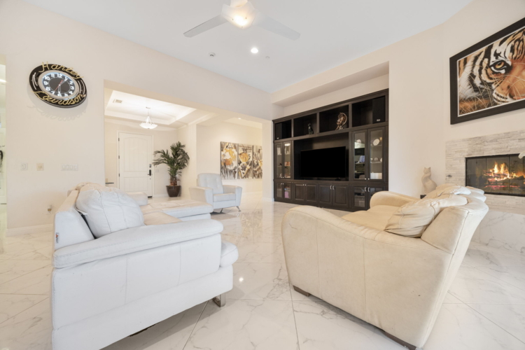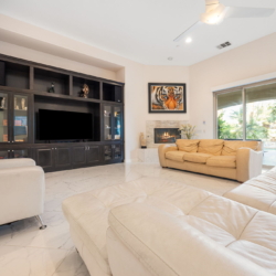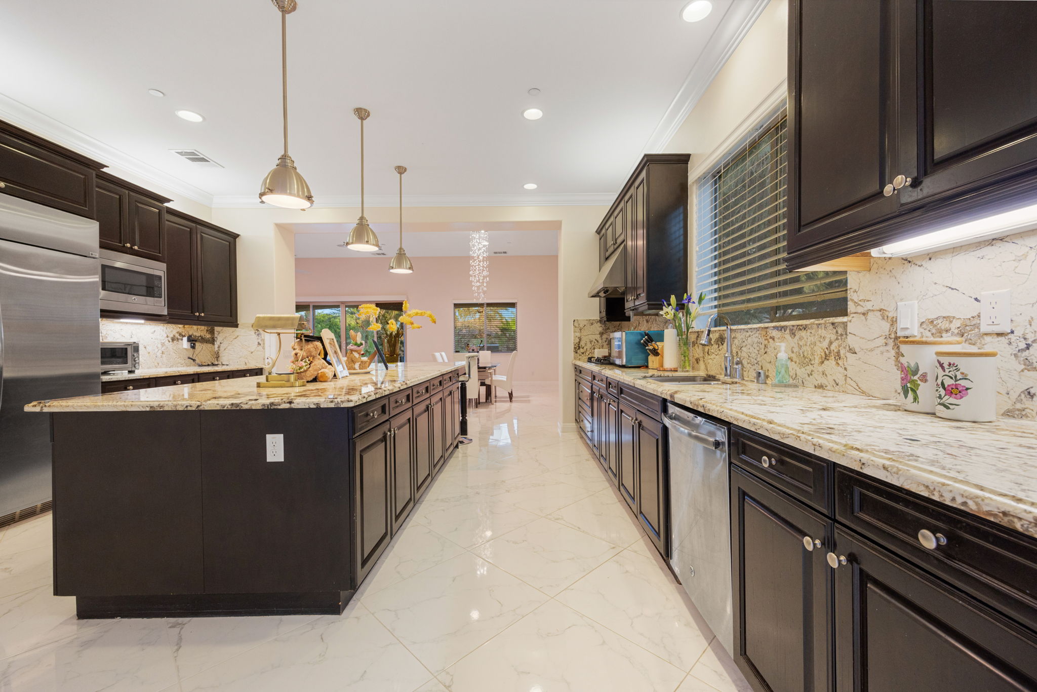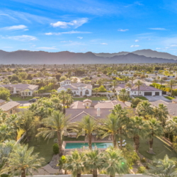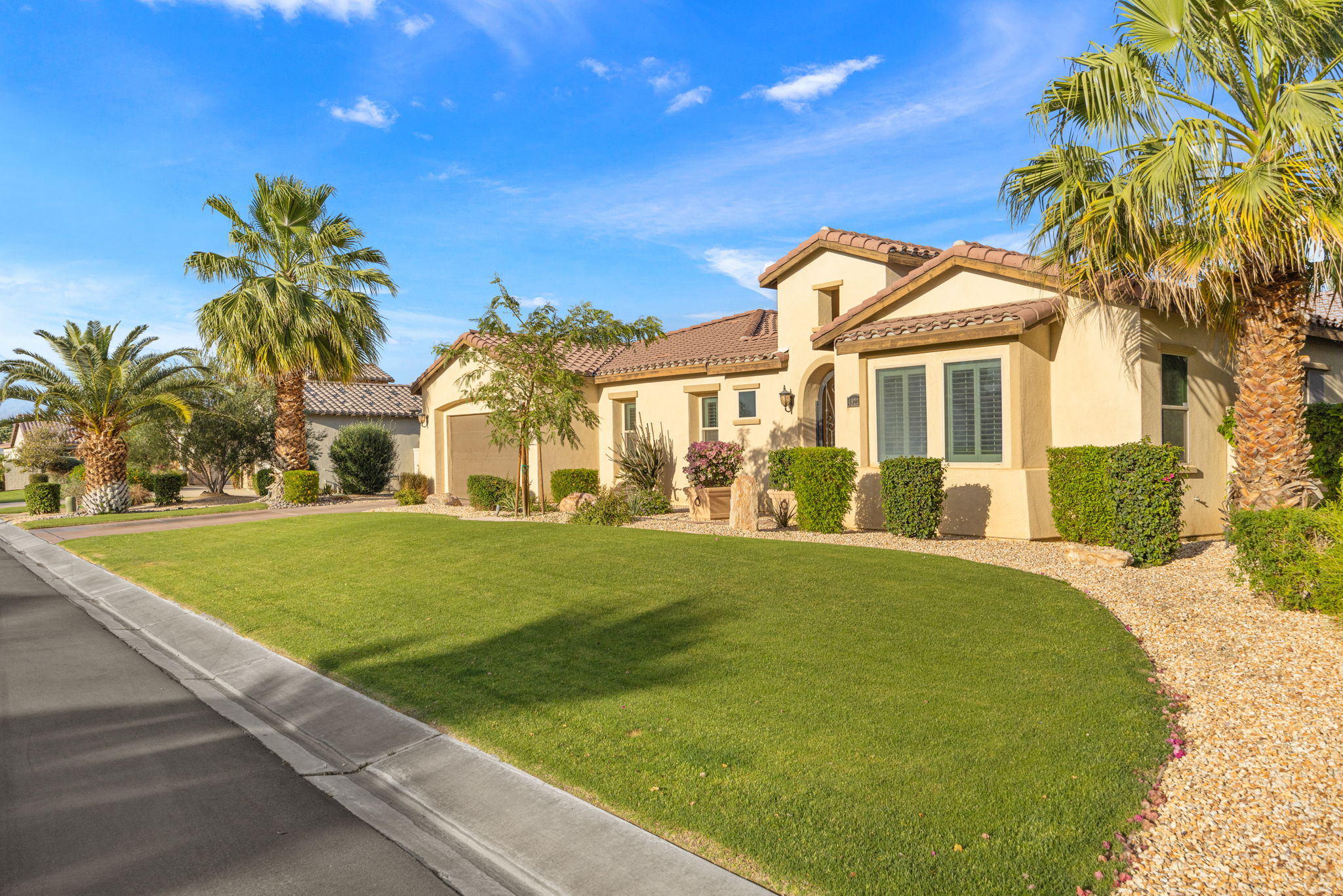 This 5 star luxury estate is set on a spectacular half acre of immaculate meandering stone pathways and artificial always pristine turf set among an oasis of date and palm trees interspersed with flowering plants, a fountain/ waterfall with a full size swimming pool, Baha deck and heated spa beckon amidst the spectacular desert scenery and is magically lit at night. The covered patio as a well appointed stone bar and BBQ with glass table chairs, sectional sofa and lawn chairs allowing relaxation or celebrations as you desire