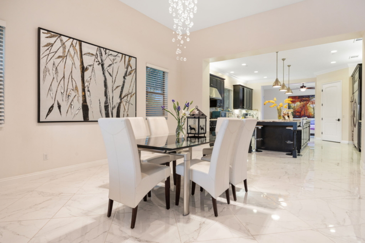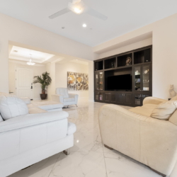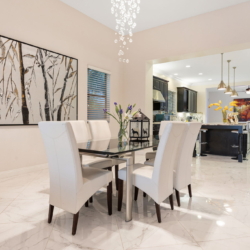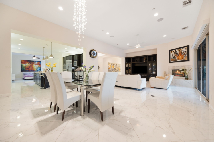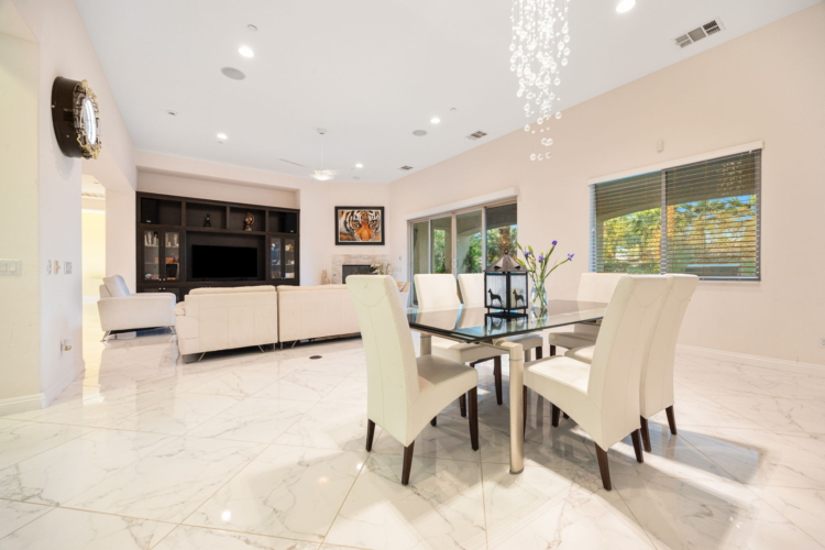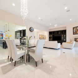 An open concept loungeroom themed on white with grey whisper floors houses multiple leather loungers, travertine coffee tables and a full entertainment center boasting surround sound backed in the rear by a smoky glass extendable dining table where 6- 8 people may enjoy a more formal meal.