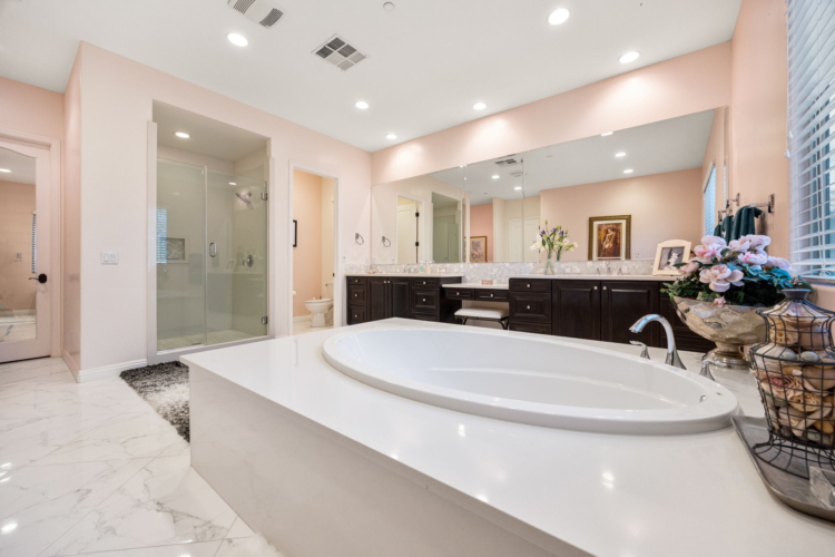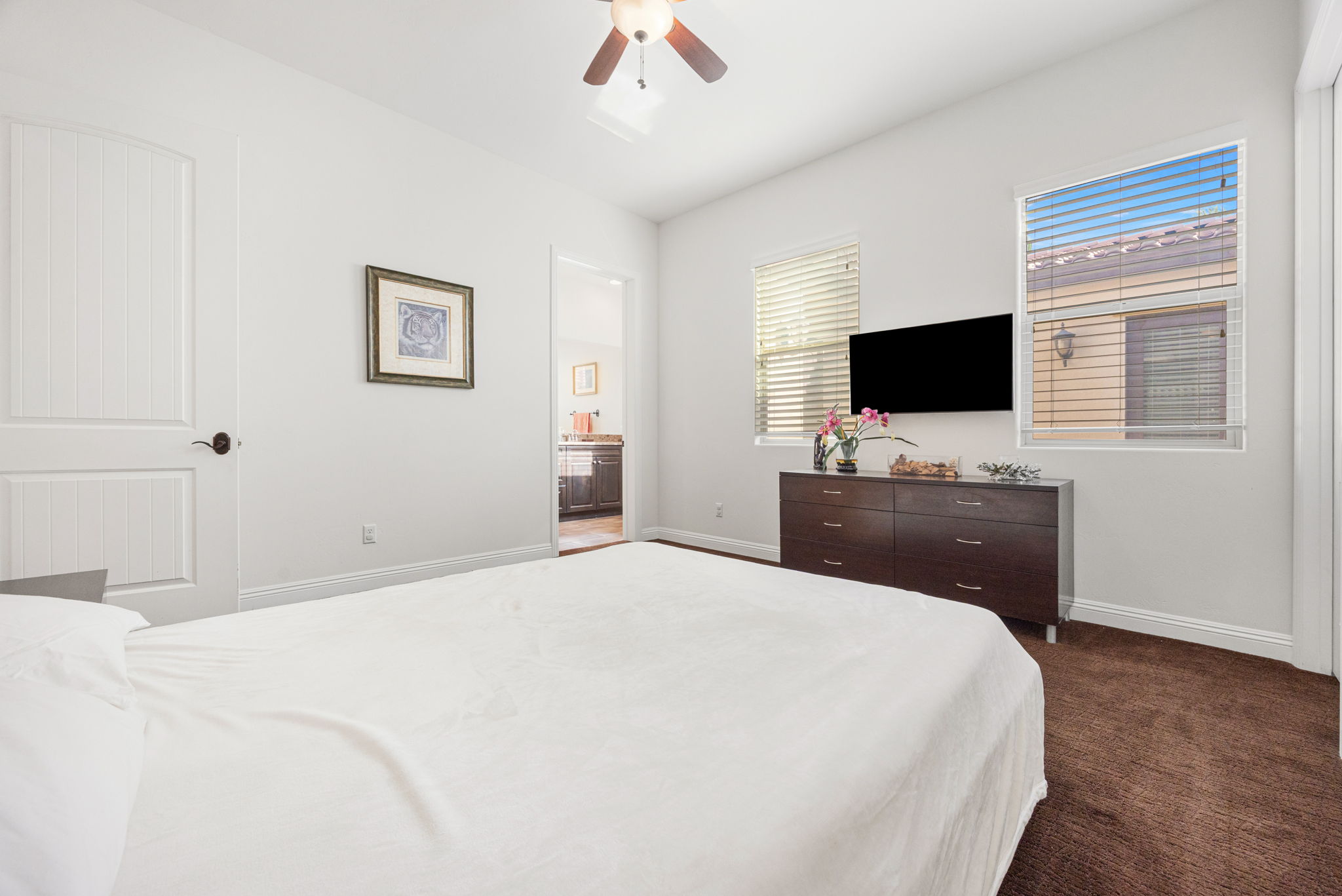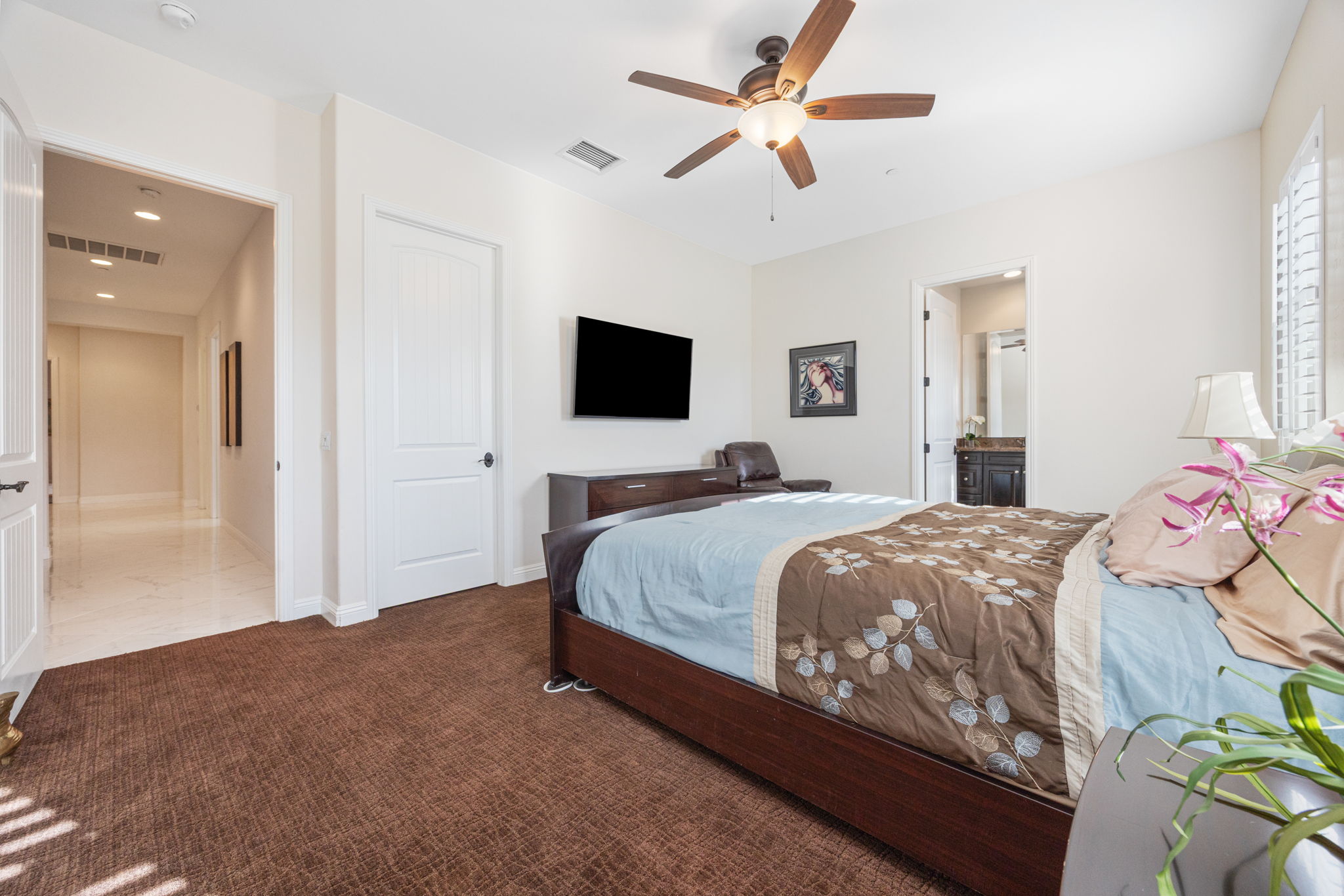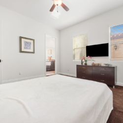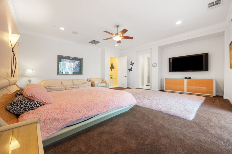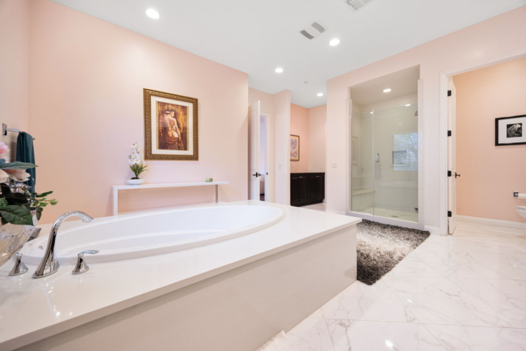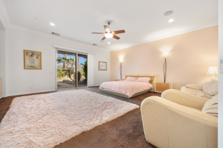 The luxurious Master Suite is complete with a plush water gel King Bed, Pioneer Elite 60 inch floating TV, ceiling fan and sconce lighting with spectacular artwork, private entrance to garden oasis and huge his and hers spectacular glass/ elite bathroom and oversized bathtub.