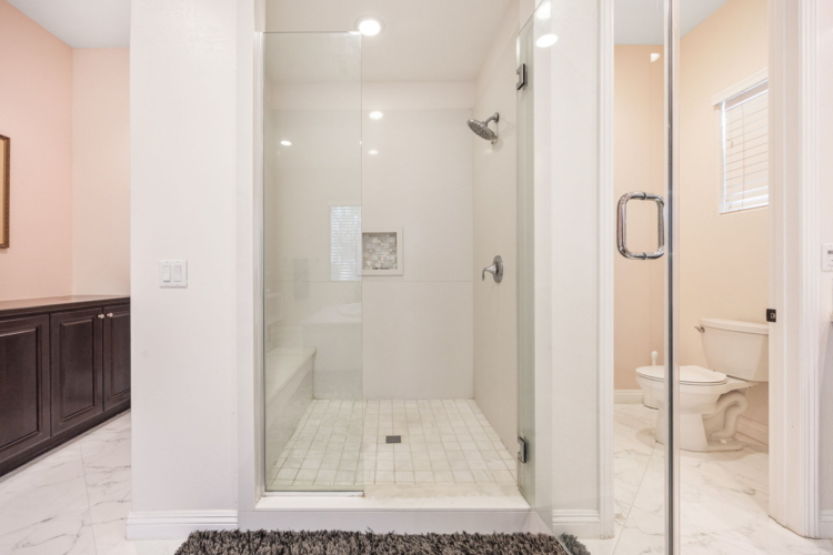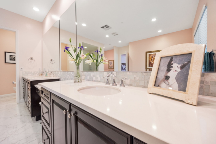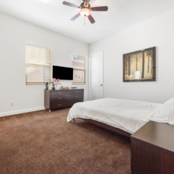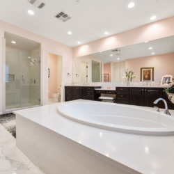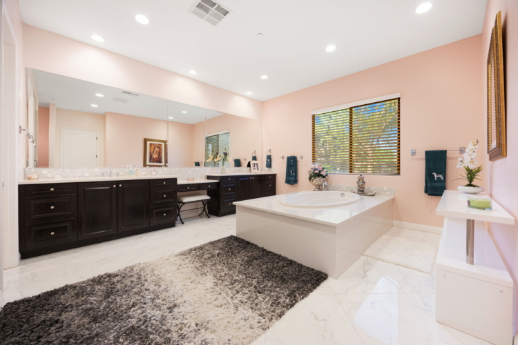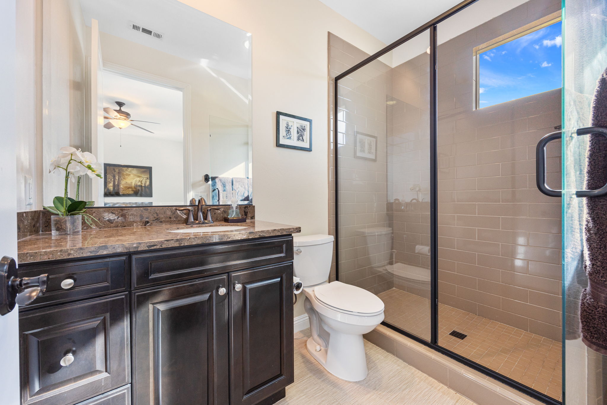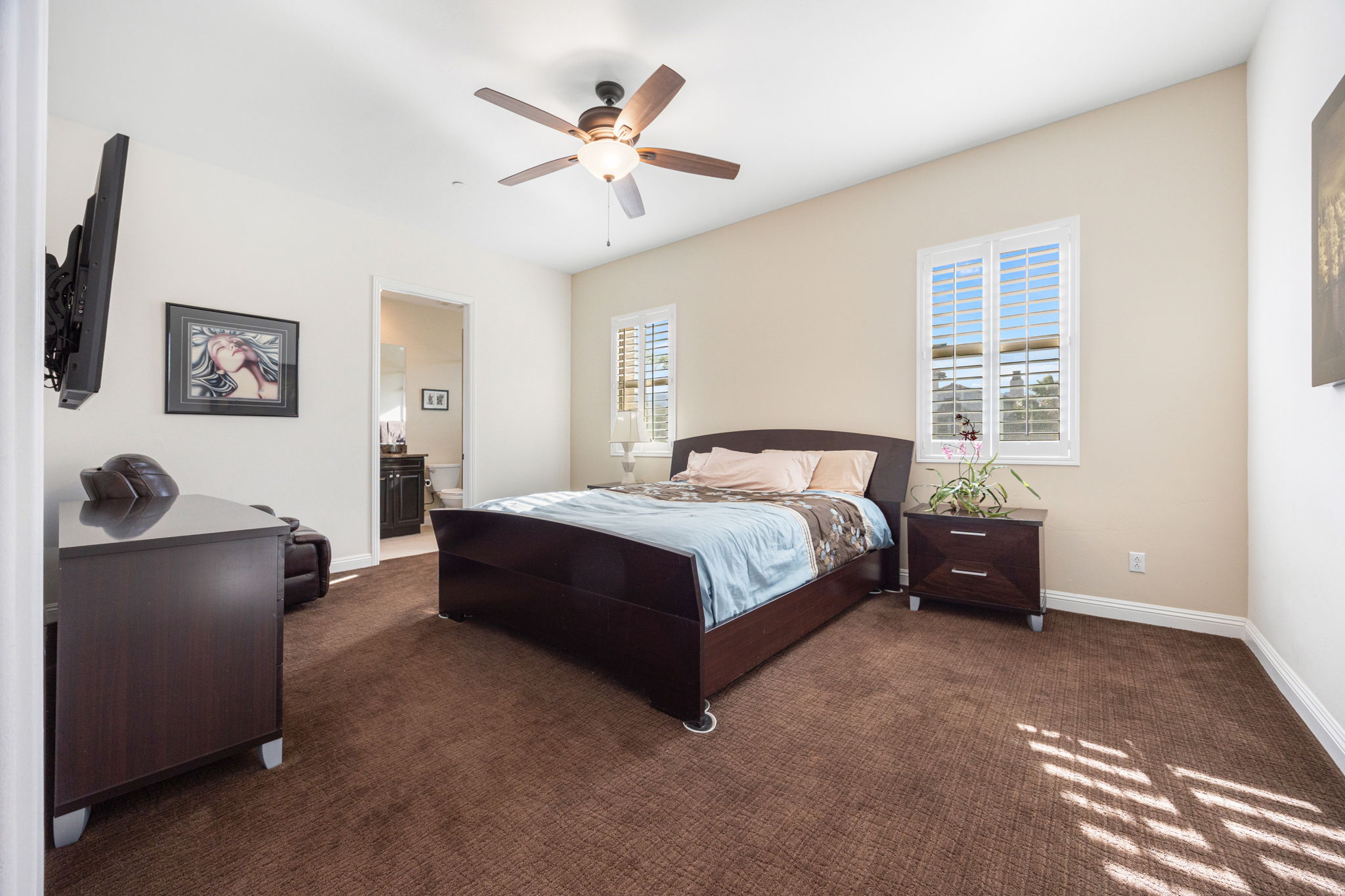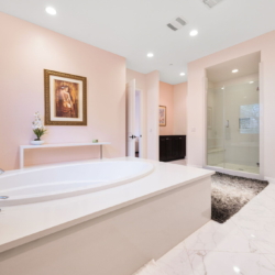 The luxurious Master Suite is complete with a plush water gel King Bed, Pioneer Elite 60 inch floating TV, ceiling fan and sconce lighting with spectacular artwork, private entrance to garden oasis and huge his and hers spectacular glass/ elite bathroom and oversized bathtub.